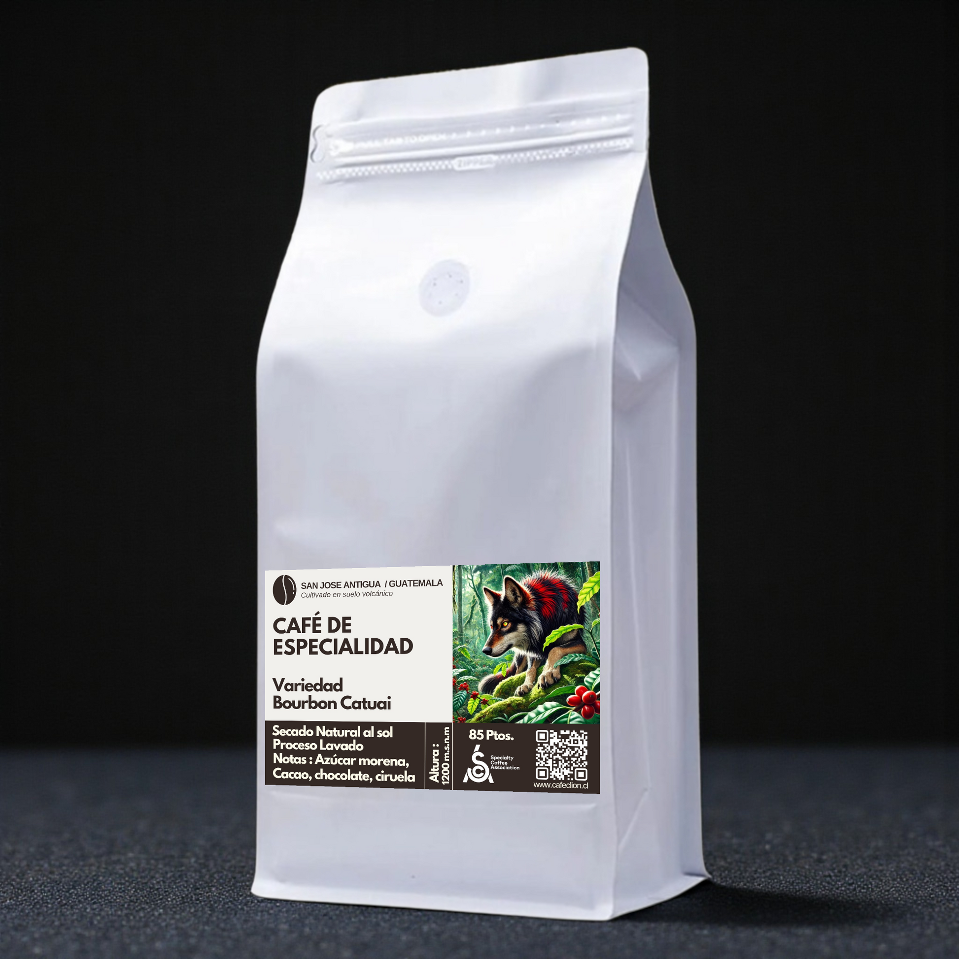 🐺 Guatemala — Variedad Bourbon Catuai San José Antigua · Suelo volcánico · 1.200 m.s.n.m · 85 Ptos. SCA Proceso Lavado · Secado natural al sol Notas: Azúcar morena · Cacao · Chocolate · Ciruela Profundo, redondo y con la personalidad mineral del suelo volcánico guatemalteco.